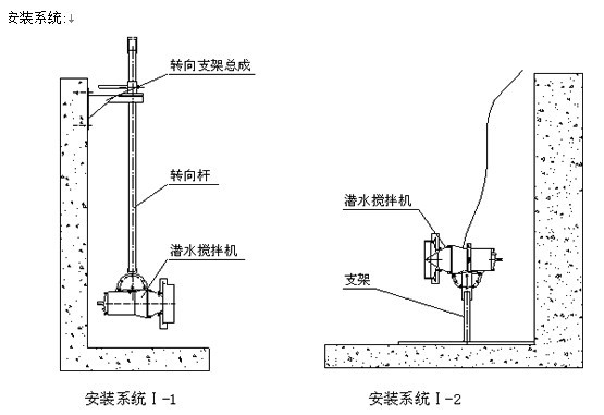 安装系统Ⅰ只适用池深<4m,机型为QJB0.85/8-260/3-740C和QJB1.5/6-260/3-980C搅拌机,其中Ⅰ-1可在水平方向和垂直方向进行调节;
