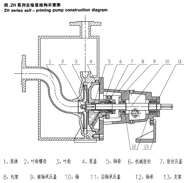 ZH型自吸式化工离心泵主要由泵体、叶轮、泵盖、轴、托架、机械密封、轴套等零件组成。详见ZH型自吸式化工离心泵结构图。